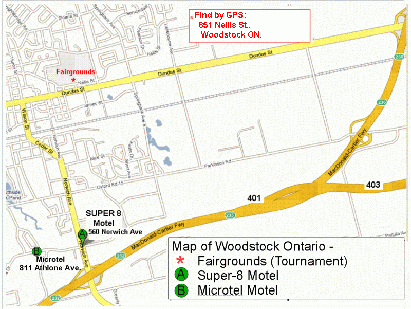 Recommended accommodations: (A) Super 8 Motel (519) 421-4588. (B) new Microtel (519) 537-2320. Both are shown on the map below, and are near Hwy. 401 exit# 232 (Norwich Ave.), about 10 minutes from the Woodstock Fairgrounds.