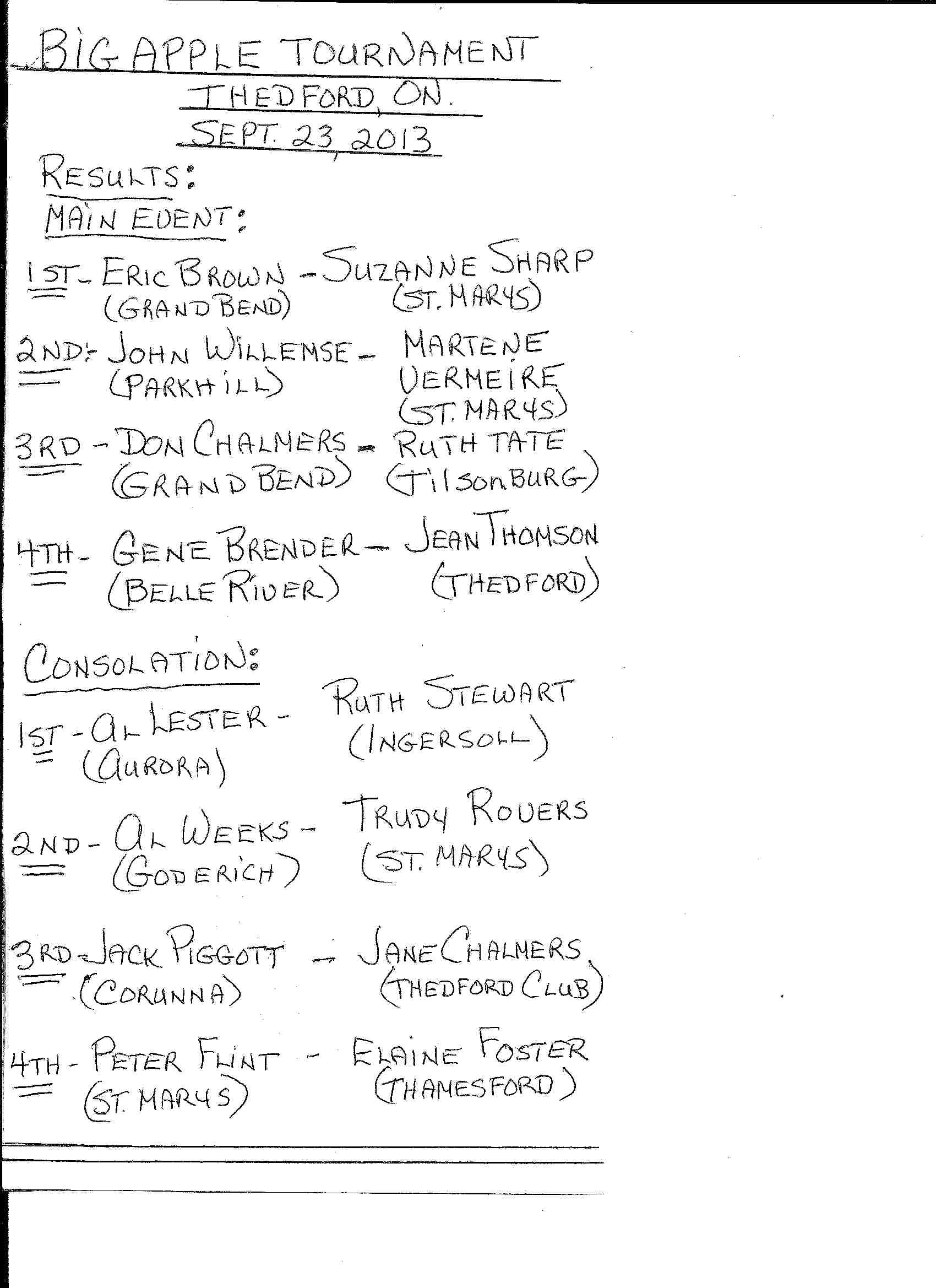 Tony has kindly sent in results from the Big Apple Tournament – Congratulations Everyone!